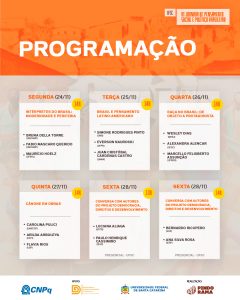 E, neste ano, de forma híbrida: os 4 primeiros dias terão programação online e, no último dia, haverá 2 mesas presenciais na Universidade Federal de Santa Catarina.